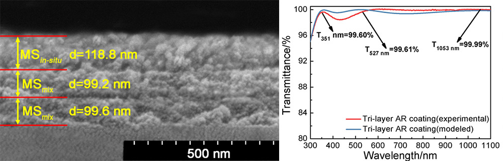 代表着溶胶凝胶法制备多层减反膜的最高水平。由三层折射率渐变的MgF2/SiO2混合膜构成,对1053nm、527nm、351nm三个波长的透射率同时达到99.6%以上,可以有效消除高功率固体激光器窗口元件表面的杂散光。