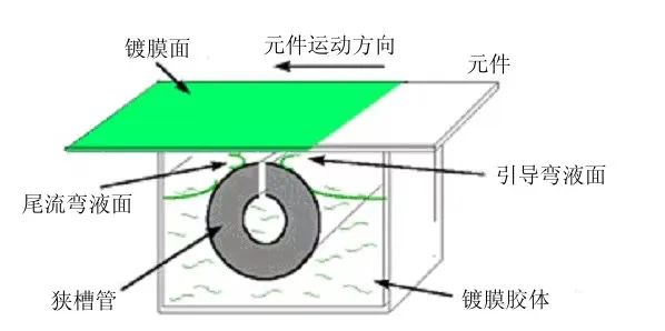 弯月面镀膜原理如下图。光学基片的待镀表面向下,在胶泵的泵送下,溶胶经过输送管道进入喷胶管内部,然后透过喷胶管的管壁,在喷胶管的出口形成了均匀向上的溶胶层流。基片的镀膜面与喷胶管外表面最高点之间的距离大约为200 μm,当基片在电机带动下水平匀速平稳地经过喷胶管上方的时候,镀膜表面和喷胶管之间就形成了持续稳定的溶胶弯月面。随着基片的前进,溶胶弯月面就在待镀表面上涂布出一层均匀的溶胶液体膜。然后,在适当的条件下干燥,加速溶胶液中溶剂的蒸发,最终在基片表面就形成一层均匀的凝胶薄膜。多余的溶胶由喷胶管外表面的下向层流收集到回收槽里,接着,经过回收管道回流到储胶筒,重新参加镀膜过程。用于镀膜的胶体放置在合适储液箱中,利用离心电机使胶体在喷胶管形成弯月面,使镀膜基片平稳平移镀膜。
